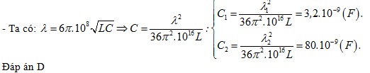 Mạch chọn sóng của một máy thu gồm một tụ điện xoay và cuộn cảm có độ tự cảm 25/(288π2) (μH). Tốc độ truyền sóng điện từ là 3.108 (m/s). Để có thể bắt được dải sóng bước sóng từ 10 m đến 50 m thì điện dung biến thiên trong khoảng nào?