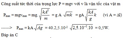 Một con lắc lò xo có độ cứng k = 40N/m đầu trên được giữ cố định còn phia dưới gắn vật m. Nâng m lên đến vị trí lò xo không biến dạng rồi thả nhẹ vật dao động điều hòa theo phương thẳng đứng với biên độ 2,5cm. Lấy g = 10m/s2.Trong quá trình dao động, trọng lực của m có công suất tức thời cực đại bằng