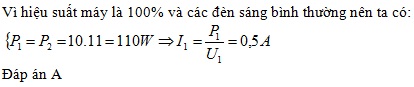 Cuộn sơ cấp của một máy biến áp được mắc vào mạng điện xoay chiều có điện áp hiệu dụng U1 = 220V. Cuộn thứ cấp nối với 10 bóng đèn giống nhau có kí hiệu 12V – 11W mắc song song. Biết các bóng đèn sáng bình thường và hiệu suất của máy biến áp 100%. Cường độ dòng điện qua cuộn sơ cấp là: