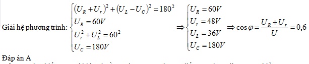 Cho mạch điện xoay chiều nối tiếp AB gồm: đoạn AM chứa điện trở thuần, đoạn MN chứa cuộn dây không thuần cảm, đoạn mạch NB chứa tụ điện. Đặt vào hai đầu AB một điện áp xoay chiều u = 180√3cos100 πt (V). Khi đó điện áp hiệu dụng hai đầu đoạn mạch AM là 60V, hai đầu đoạn mạch MN là 60V, hai đầu đoạn mạch NB là 180V. Hệ số công suất của mạch là: