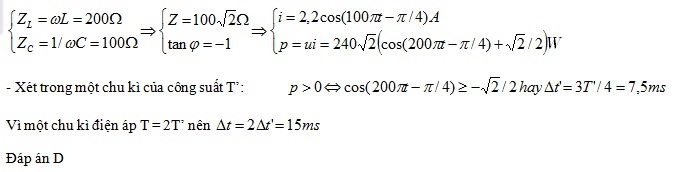 Đặt điện áp xoay chiều u = 220√2.cos(100πt)V (t tính bằng giây) vào hai đầu đoạn mạch gồm điện trở R = 100Ω, cuộn cảm thuần L = 2/p(H) và tụ điện C = 100/p(μF) mắc nối tiếp. Trong một chu kỳ, khoảng thời gian điện áp hai đầu đoạn mạch sinh công dương cung cấp điện năng cho mạch bằng