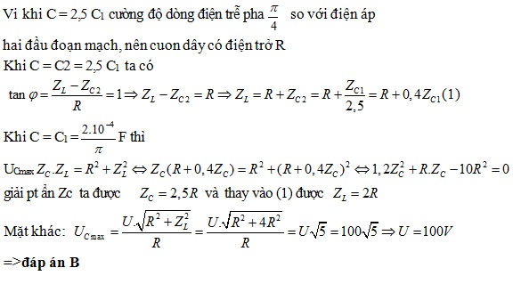 (V). Khi C = 2,5 C1 thì cường độ dòng điện trễ pha