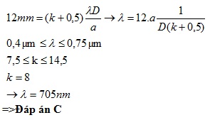Thực hiện thí nghiệm I – âng về giao thoa ánh sáng. Khoảng cách giữa hai khe là 1 mm, màn quan sát đặt song song với mặt phẳng chứa hai khe và cách hai khe 2m. Chiếu sáng hai khe bằng ánh sáng trắng có bước sóng 0,4 µm ≤ λ ≤ 0,75 µm. Bước sóng lớn nhất của các bức xạ cho vân tối tại điểm N trên màn, cách vân trung tâm 12 mm, là