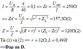 Trong giờ thực hành, một học sinh mắc đoạn mạch AB gồm điện trở thuần R = 40 Ω, tụ điện có điện dung C và cuộn dây có độ tự cảm L nối tiếp nhau theo đúng thứ tự trên. Gọi M là điểm nối giữa điện trở thuần và tụ điện, N là điểm nối giữa tụ điện và cuộn dây. Đặt vào hai đầu đoạn mạch AB một điện áp xoay chiều tần số 50 Hz và có giá trị hiệu dụng UAB = 12 V. Dùng vôn kế để đo các điện áp hiệu dụng, thu được kết quả: UAM = 4,00 V; UMN = 25,00 V; UNB = 15,73 V. Độ tự cảm và điện trở thuần của cuộn dây có giá trị lần lượt là