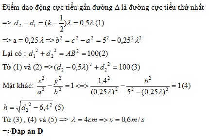 Trên mặt thoáng của một chất lỏng có hai nguồn sóng A, B cách nhau 10 cm, dao động cùng pha, cùng tần số f = 15 Hz. Gọi Δ là đường trung trực của AB. Xét trên đường tròn đường kính AB, điểm mà phần tử ở đó dao động với biên độ cực tiểu cách Δ khoảng nhỏ nhất là 1,4 cm. Tốc độ truyền sóng trên bề mặt chất lỏng bằng