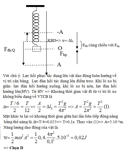 Con lắc lò xo treo thẳng đứng. Đầu trên gắn với điểm cố định Q, đầu dưới là vật nặng khối lượng m=400g. Kích thích cho con lắc dao động điều hòa thì thấy: Trong 1 chu kỳ khoảng thời gian lực tác dụng lên điểm Q cùng chiều với lực kéo về tác dụng lên vật là T/6 và khoảng thời gian giữa hai lần liên tiếp động năng bằng thế năng là 0,025s. Lấy g≈π2. Năng lượng dao động của con lắc là: