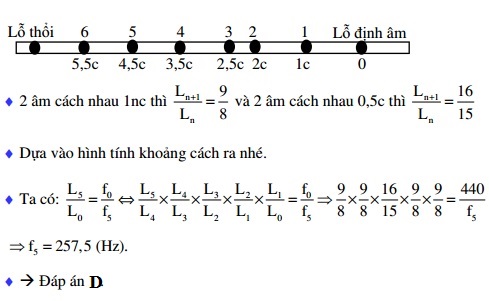 (v là tốc độ truyền âm trong không khí bằng 340m/s). Một ống sáo phát ra âm cơ bản có tần số f = 440Hz. Lỗ thứ 5 phát ra âm cơ bản có tần số