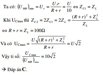 Đặt điện áp xoay chiều u = Uocos(ωt) vào hai đầu đoạn mạch AB có điện trở R = 90Ω mắc nối tiếp với cuộn dây không thuần cảm có r = 10 Ω và tụ điện có điện dung C thay đổi được theo thứ tự như hình vẽ bên. M là điểm nối giữa R và cuộn dây, khi C = C1 thì điện áp hiệu dụng hai đầu đoạn mạch MB đạt giá trị cực tiểu bằng U1; Khi C = C2 = 0,5C1 thì điện áp hiệu dụng trên tụ điện đạt giá trị cực đại bằng U2. Tỉ số