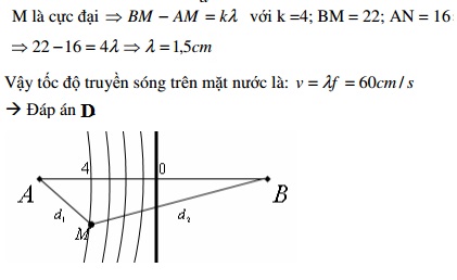 Trên mặt nước có hai nguồn sóng kết hợp A và B dao động điều hòa theo phương thẳng đứng, cùng pha, cùng tần số 40Hz. Tại điểm M trên mặt nước, cách A và B lần lượt 16cm và 22cm, phần tử nước tại đó dao động với biên độ cực đại. Trong khoảng giữa M và đường trung trực của AB còn có 3 đường cực đại nữa. Tốc độ truyền sóng trên mặt nước là