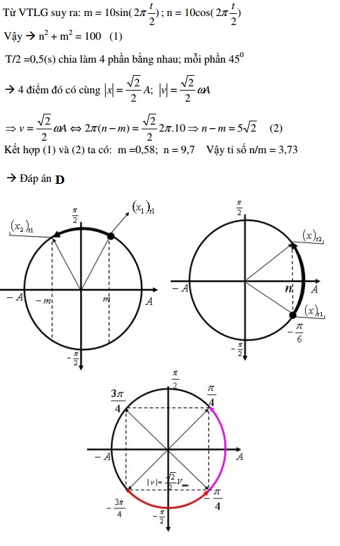 Một vật dao động điều hòa với phương trình x = 10 cos(2πt + φ). Biết rằng trong một chu kỳ, khoảng thời gian ngắn nhất giữa hai lần liên tiếp vật cách vị trí cân bằng một khoảng m(cm) bằng với khoảng thời gian giữa hai lần liên tiếp vật cách vị trí cân bằng một khoảng n(cm); đồng thời khoảng thời gian mà tốc độ không vượt quá 2π(m – n) cm/s là 0,5s. Tỉ số n/m xấp xỉ
