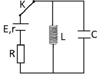 Một mạch điện bố trí như hình vẽ bên. Biết E = 12V, r = 1Ω, R = 5 Ω, cuộn dây thuần cả có độ tự cảm L và tụ điện có điện dung C = 8 μF. Ban đầu khóa K đóng và mạch ổn định. Ngắt khóa K, mạch LC dao động điện từ với hiệu điện thế cực đại trên tụ là 12V. Giá trị của L bằng