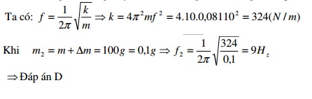 Gắn vật nặng có khối lượng m = 81g vào một lò xo lí tưởng thì tấn số dao động của vật là 10Hz. Gắn thêm một gia trọng có khối lượng Δm = 19g vào vật m thì tần số dao động của hệ bằng