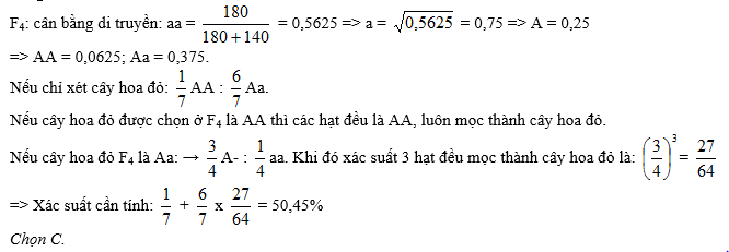 Ở đậu Hà Lan, tính trạng hoa đỏ là do gen A qui định trội hoàn toàn so với gen a qui định hoa trắng, gen quy định tính trạng nằm trên NST thường. Cho 2 cây có kiểu hình khác nhau giao phấn với nhau được F1, sau đó cho các cây F1 ngẫu phối liên tiếp đến F4 thu được 180 cây hoa trắng và 140 cây hoa đỏ. Chọn ngẫu nhiên một cây hoa đỏ ở F4 cho tự thụ phấn thu được các quả. Nếu giả sử mỗi quả đều chứa 3 hạt thì xác suất để cả 3 hạt trong cùng một quả khi đem gieo đều mọc thành cây hoa đỏ là:
