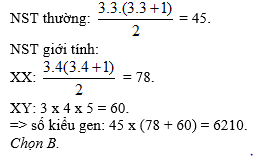 Trong một quần thể, xét 5 gen: gen 1 có 3 alen, gen 2 có 3 alen, hai gen này cùng nằm trên một nhiễm