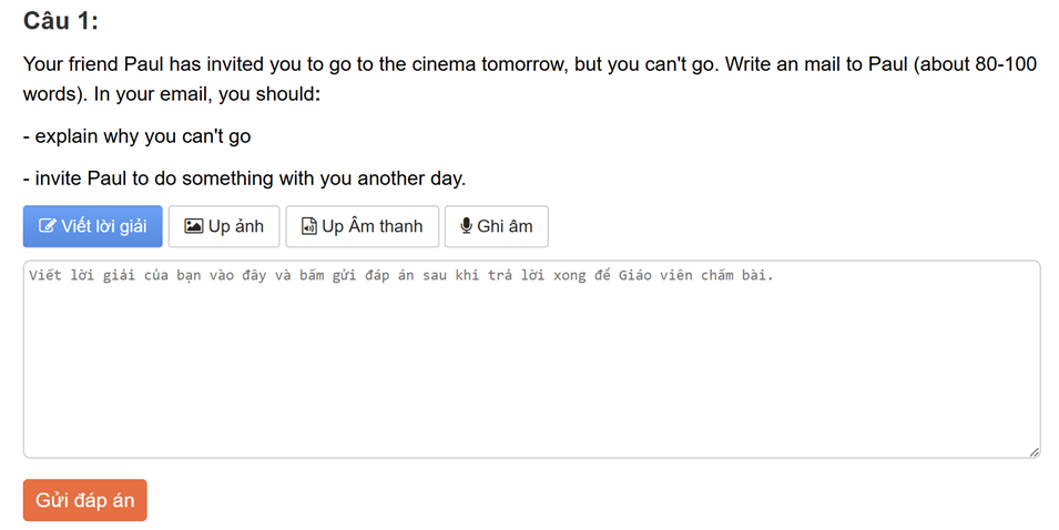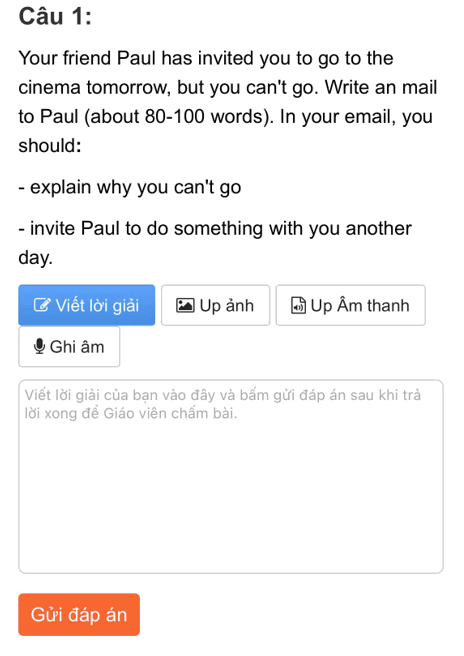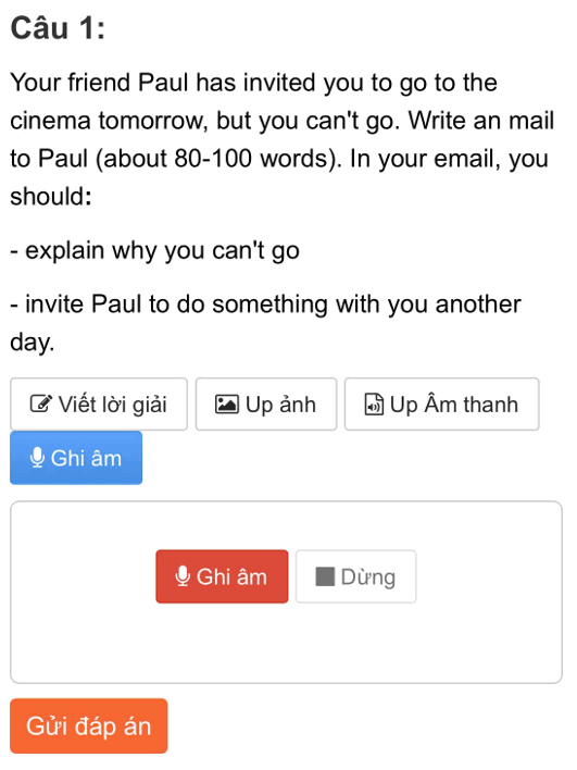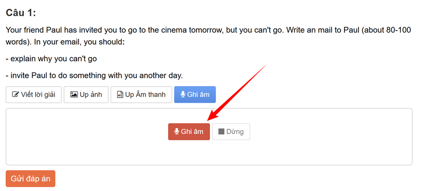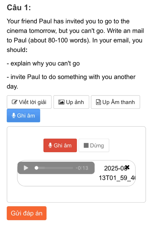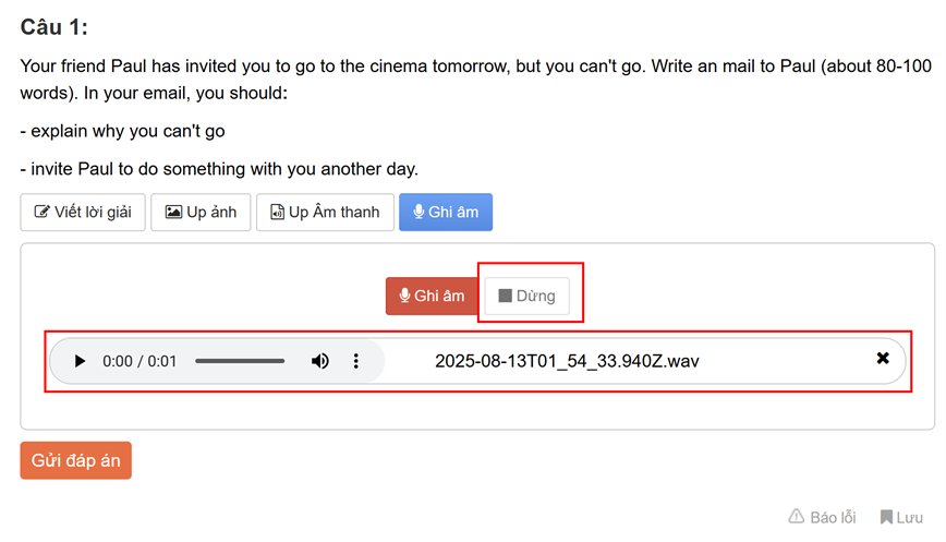 Bước 4: Nhấn “Gửi đáp án” và nộp bài sau khi hoàn thành bài thi. Thầy/cô sẽ nhận được bài speaking của bạn và chấm chữa chi tiết sau tối đa 2 ngày tính từ ngày nộp bài (Chú ý các bài speaking cũng chỉ được chấm 2 lần nộp bài đầu tiên tương tự bài tập tự luận)