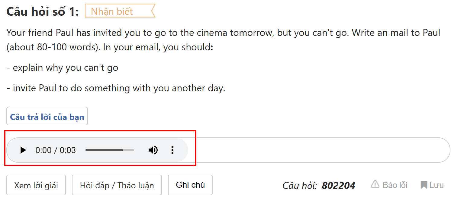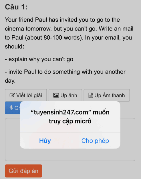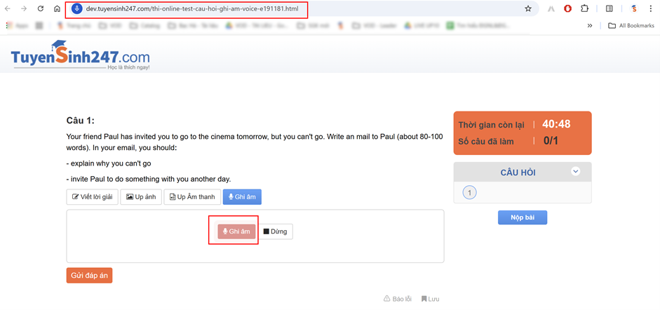 Chức năng ghi âm hoặc tải file Speaking trên Tuyensinh247.com giúp bạn luyện tập kỹ năng nói một cách linh hoạt, thuận tiện và hiệu quả. Hãy sử dụng để cải thiện phát âm và ngữ điệu và Chuẩn bị tốt nhất cho các kỳ thi nhé!