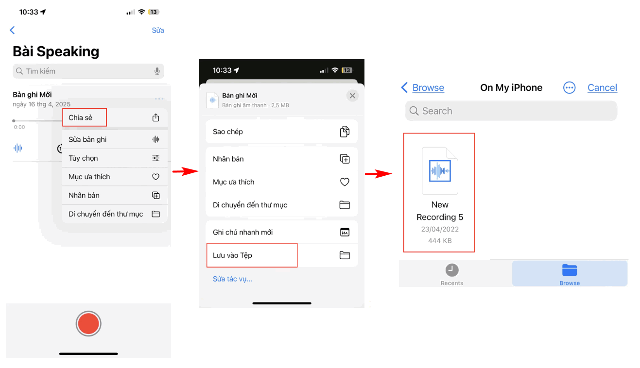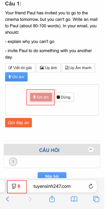 Ghi âm bằng ứng dụng ghi âm trên điện thoại >> Lưu file ghi âm vào tệp >> Chọn upload file tại câu hỏi trên Tuyensinh247.com và chọn tệp vừa ghi âm và chia sẻ.