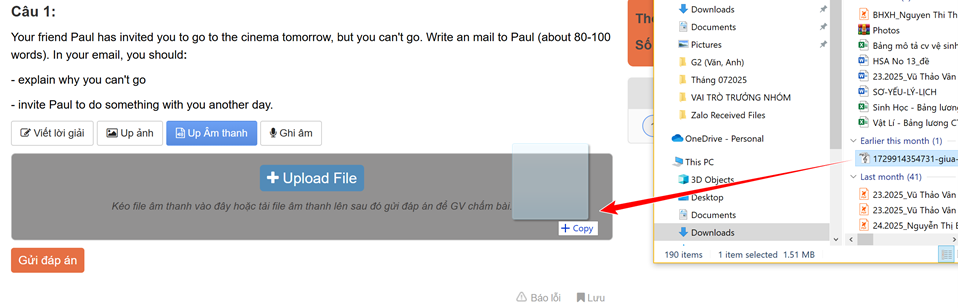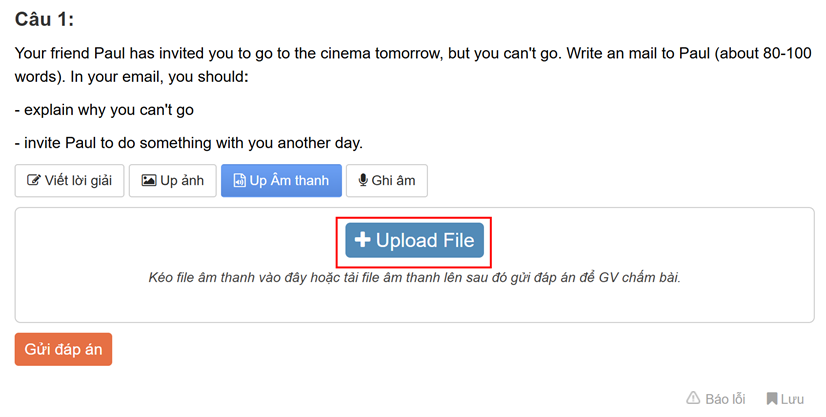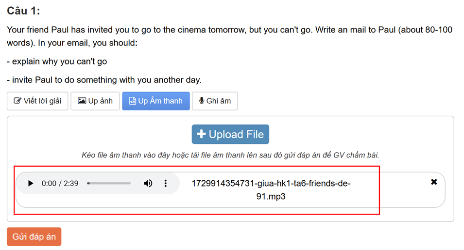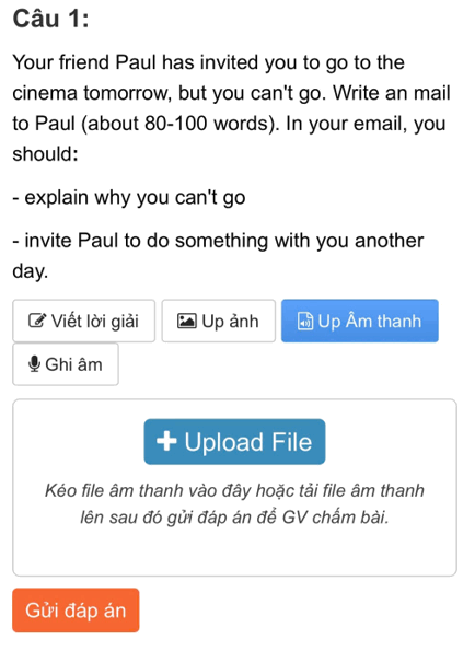 Sau khi nộp bài, học sinh cũng có thể nghe lại file ghi âm trực tiếp hoặc file upload của mình