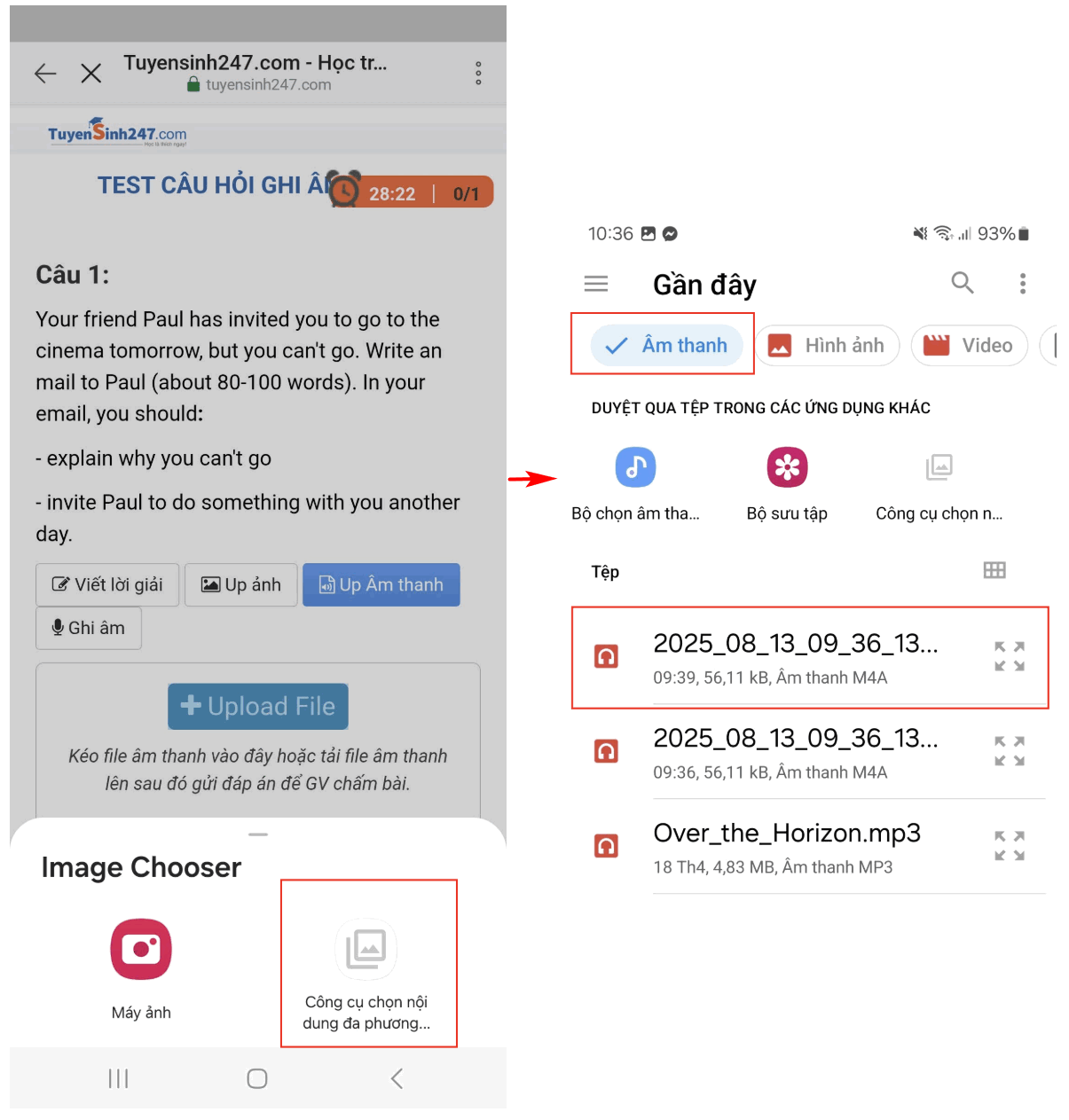Ghi âm bằng ứng dụng ghi âm trên đoạn thoại >> Chọn Upload file tại câu hỏi trên Tuyensinh247.com và chọn Công cụ nội dung đa phương tiện >> Chọn loại âm thanh và chọn tệp ghi âm bạn muốn tải lên