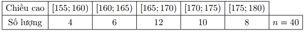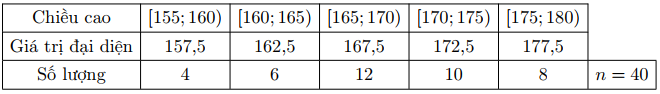 Người ta thống kê chiều cao (đơn vị: cm ) của các bạn học sinh lớp 12 A , thu được bảng số liệu sau. Phương sai của mẫu số liệu trên là