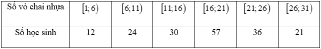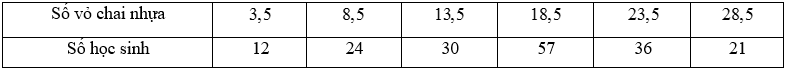 Trong tuần lễ bảo vệ môi trường, các em học sinh khối 12 của trường X đã tiến hành thu nhặt vỏ chai nhựa để tái chế. Nhà trường thống kê kết quả thu nhặt vỏ chai nhựa của các em học sinh theo bảng số liệu sau: