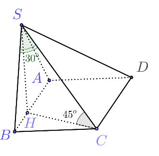 Cho hình chóp \(S.ABCD\) có đáy \(ABCD\) là hình vuông cạnh \(a\), mặt bên \(\left( {SAB} \right)\) nằm trong mặt phẳng vuông góc với đáy. Biết góc tạo bởi đường thẳng \(SC\) với mặt phẳng đáy, mặt phẳng \(\left( {SAB} \right)\) lần lượt là \(45^\circ \) và \(30^\circ \). Tính thể tích khối chóp \(S.ABCD\) theo \(a\).