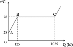 Một thí nghiệm khảo sát sự thay đổi nhiệt độ của một lượng rượu Etylic theo nhiệt lượng cung cấp thu được đồ thị có dạng như hình bên. Biết nhiệt dung riêng của rượu Etylic là c = 2500 J/(kgK). Nhiệt hóa hơi riêng của rượu Etylic xác định được trong thí nghiệm trên là bao nhiêu kJ/kg?