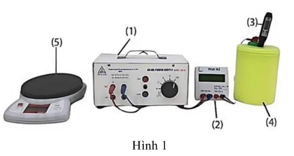 Một nhóm học sinh lớp 12 thực hiện thí nghiệm thực hành đo nhiệt nóng chảy riêng của nước đá. Họ đã lựa chọn bộ dụng cụ thí nghiệm như hình 1 gồm: biến thế nguồn (1), bộ đo cồng suất nguồn điện có tích hợp chức năng đo thời gian (2), nhiệt kế điện tử có độ phân giải nhiệt độ ±0, 1∘C (3), nhiệt lượng kế bằng nhựa có vỏ xốp kèm dây điện trở (4), cân điện tử (5), các dây nối.