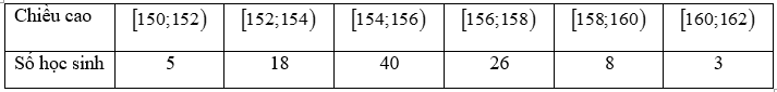 Đo chiều cao của 100 học sinh, ta thu được kết quả như bảng dưới đây. Phương sai của mẫu số liệu ghép nhóm trên là \(\overline{a, b c d e}\), với \(a,b,c,d,e\) là các số tự nhiên. Khi đó \(a + b + c + d + e\) bằng