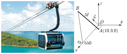 Một cabin cáp treo xuất phát từ điểm \(A\left( {10;3;0} \right)\) và chuyển động đều theo đường cáp có vectơ chỉ phương là \(\vec u = \left( {2; - 2;1} \right)\) với tốc độ là \(4,5\left( {m/s} \right)\) (đơn vị trên mỗi trục tọa độ là mét) được mô hình hóa như các hình vẽ sau: