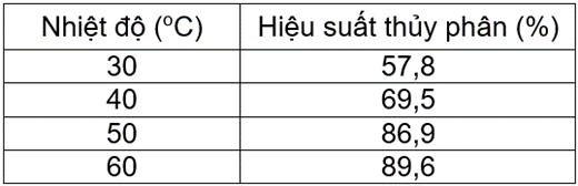 Để sản xuất glucose bằng phương pháp sinh học, bột khoai lang được hòa với nước (chỉnh pH của dịch về 4,2), hàm lượng bột khoai là 20% khối lượng. Chế phẩm thương mại Stargen 002 (chứa hệ enzyme amylase phân giải tinh bột thành đường) được bổ sung với hàm lượng 1,5 mL/kg bột khoai, rồi tiến hành phản ứng thủy phân ở các nhiệt độ khác nhau là 30, 40, 50 và 55 °C. Hiệu suất của quá trình thủy phân được xác định bằng tỷ lệ giữa lượng glucose thu được sau phản ứng chia cho lượng glucose lý thuyết (quy đổi từ tinh bột trong bột khoai ban đầu). Ảnh hưởng của nhiệt độ phản ứng đến hiệu suất thủy phân được trình bày trong bảng 1.