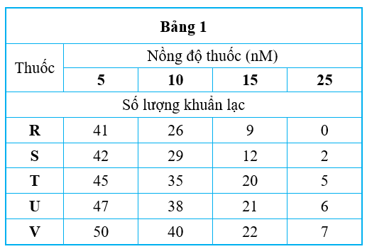 Số lượng vi khuẩn kháng penicillin bằng nhau được đưa vào các bình chứa $10,0 \mathrm{ml}$ môi trường dinh dưỡng. Các bình được ủ trong 1 giờ ở 37 độ C cùng với các nồng độ khác nhau của 5 loại thuốc được trình bày trong Bảng 1 . Bình đối chứng bao gồm các vi khuẩn được ủ trong môi trường không có bất kỳ loại thuốc nào. Sau đó, vi khuẩn được rửa sạch để loại bỏ vết thuốc còn sót lại và nuôi cấy trên đĩa thạch dinh dưỡng trong 7 ngày. Trong thời gian này, vi khuẩn sinh sản, tạo thành các khuẩn lạc, sau đó được đếm vào cuối ngày thứ bảy. Các đĩa có nhiều khuẩn lạc hơn được cho là có nhiều vi khuẩn sống hơn vào cuối thời gian ủ 1 giờ. Bảng 1 cho thấy số lượng khuẩn lạc được đếm. Kiểm soát không có thuốc cho thấy 50 khuẩn lạc vào cuối 7 ngày.