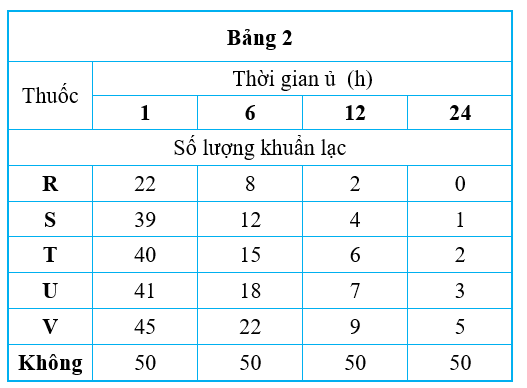 Nếu Thí nghiệm 2 được lặp lại với Thuốc $U$ và thời gian ủ là 3 giờ, số lượng khuẩn lạc đếm được rất có thể là: