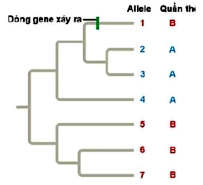 | d) Dòng gene đã không xảy ra giữa allele 1 với allele 2, 3, 4 và xảy ra giữa allele 1 với các allele 5, 6, 7. |