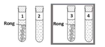 Một thí ng̣hiệm sử dụng rong đuôi chồn được bố trí như trong hình: ống 1 và ống 2 có chiếu sáng; ống 3 và ống 4 đặt trong tối; các điều kiện thí nghiệm khác là như nhau. Ở ống nghiệm nào bọt khí O2 được tạo ra nhiều nhất?