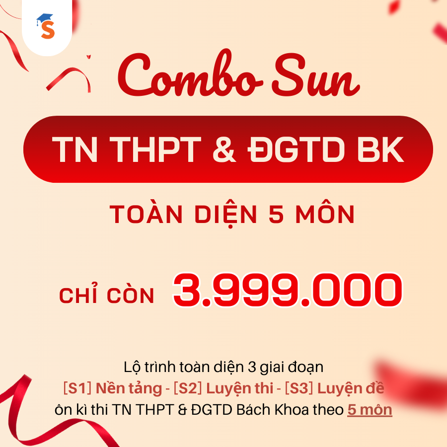 - Combo SUN TN THPT & ĐGTD BK (TSA) (2K8) - TOÀN DIỆN 5 MÔN (TOÁN, ĐỌC HIỂU, LÍ, HOÁ, SINH)