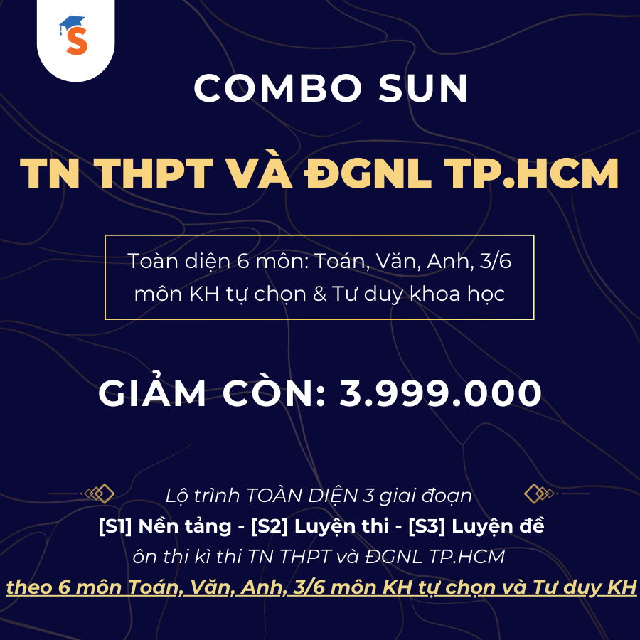 - Combo SUN TN THPT & ĐGNL TP. HCM (2k8) - TOÀN DIỆN 6 MÔN (TOÁN, VĂN, ANH, 3/6 MÔN KH TỰ CHỌN) VÀ TƯ DUY KHOA HỌC