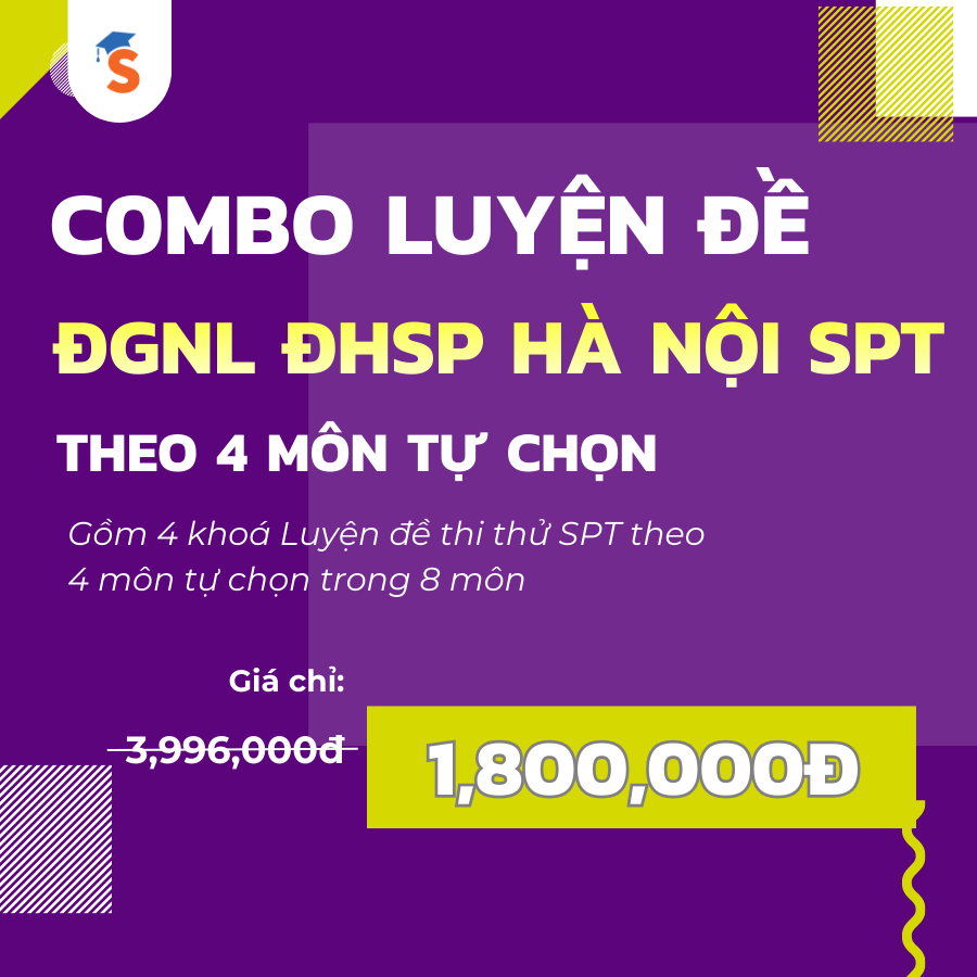 - - 04 Khoá [S3] Luyện đề thi thử ĐGNL Sư phạm Hà Nội SPT theo 4 môn tự chọn trong 8 môn (Toán, Văn, Anh, Lí, Hoá, Sinh, Sử, Địa)