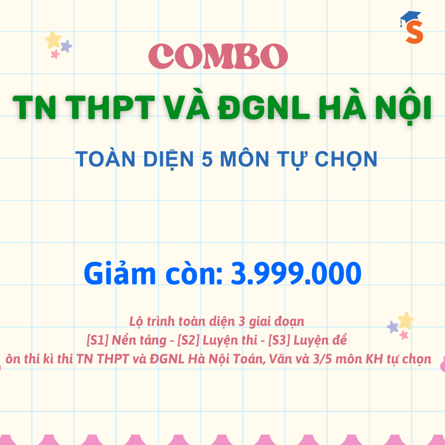 - - Học phí: Cực kì tiết kiệm, phù hợp với mọi đối tượng học sinh. Chỉ 3.999.000đ cho 16 khoá học của 5 môn tự chọn, vừa luyện thi TN THPT vừa luyện thi ĐGNL Hà Nội (HSA), mỗi môn đầy đủ 3 giai đoạn [S1] Nền tảng kiến thức - [S2] Luyện thi chuyên sâu - [S3] Luyện đề chi tiết cho từng kì thi.