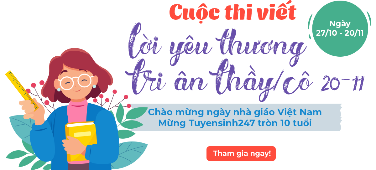 Hòa chung với không khí 20/11, hưởng ứng Ngày Nhà Giáo Việt Nam xin gửi những lời chúc chân thành nhất đến các thầy cô Tuyensinh247, chúc thầy cô sức khỏe, hạnh phúc, thành công trên con đường giảng dạy và luôn tràn đầy nhiệt huyết cống hiến cho nền giáo dục nước nhà, cập bến thành công những bến đò tương lai.